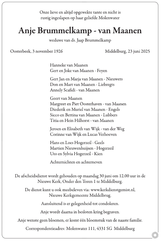 Mevrouw Anje van Maanen is afgelopen maandag overleden in Middelburg.